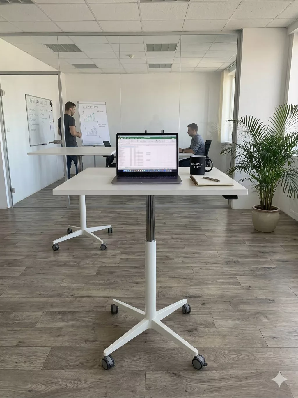 A 80x80 cm-es asztallap elegendő helyet biztosít egy laptopnak, monitorának, billentyűzetének és egyéb irodai eszközöknek. Az asztal stabil, fémvázas kialakítása és a görgős kerekek biztosítják a tartósságot és a mobilitást. A beépített fékrendszer pedig gondoskodik arról, hogy az asztal stabilan álljon a helyén, amikor szüksége van rá.