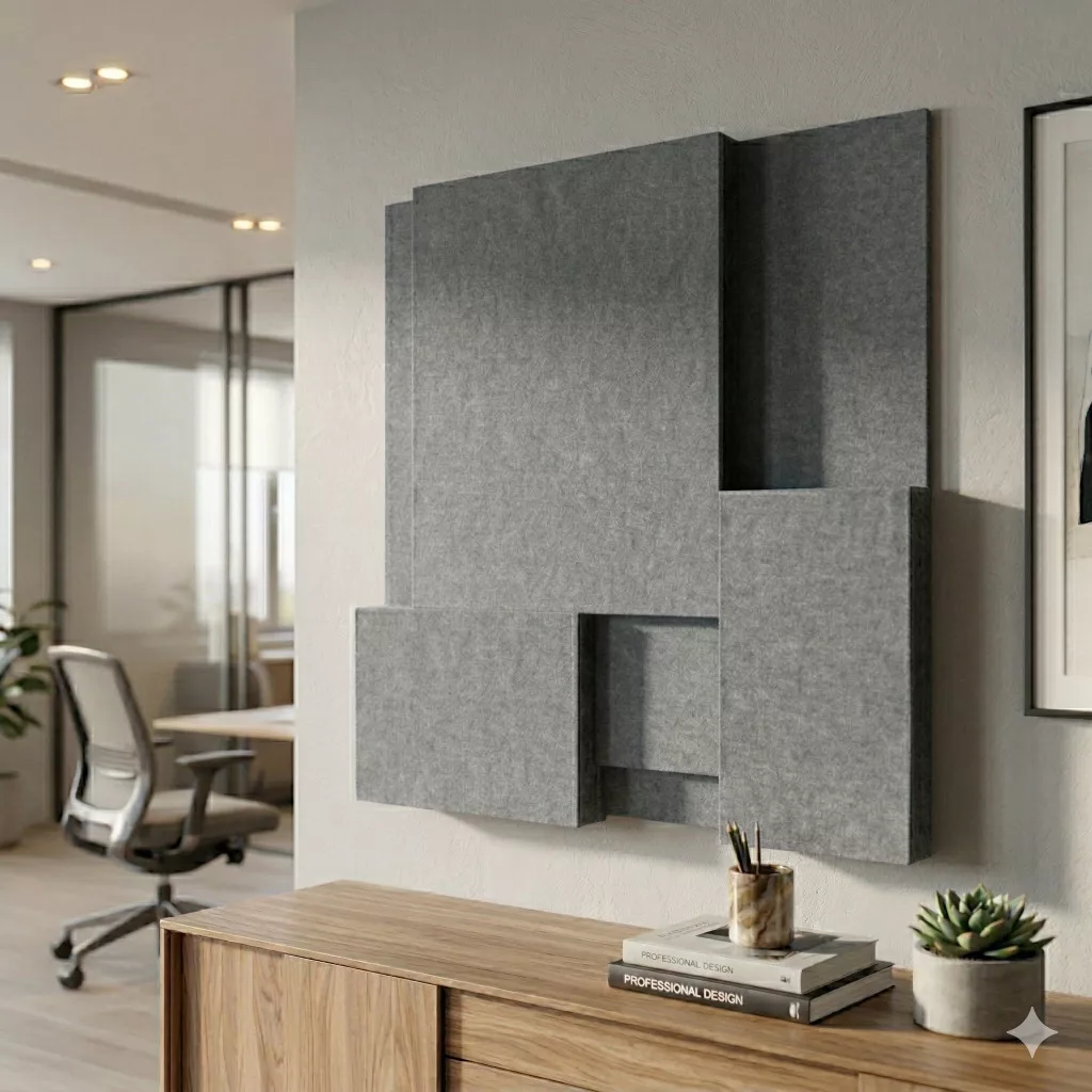 Kialakítása: Több, különböző méretű és mélységű téglalap alakú lapból áll, amelyeket egymásra rétegeztek. Ez a 3D-s hatás nemcsak jól néz ki, hanem növeli a felületet, így hatékonyabban töri meg a hanghullámokat.