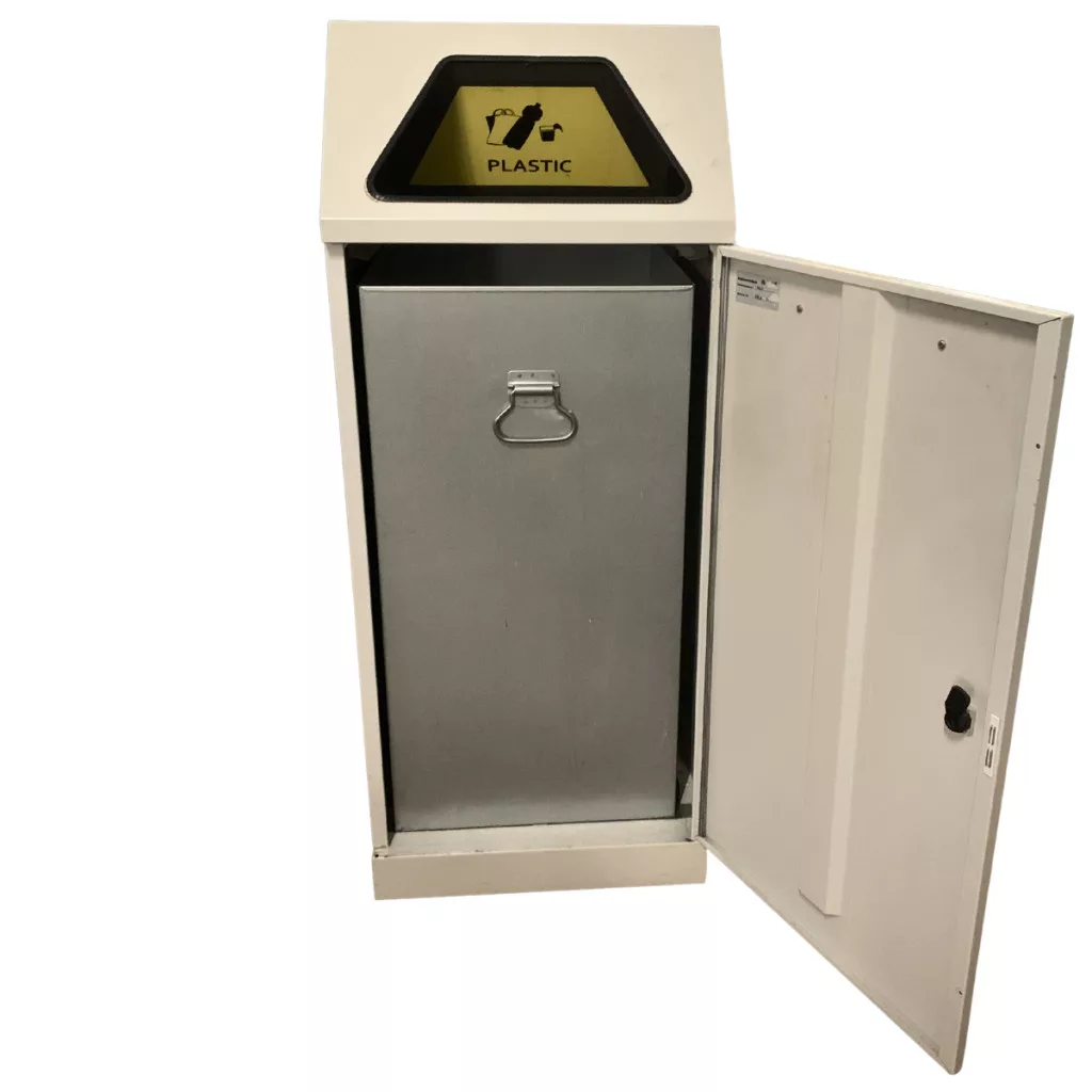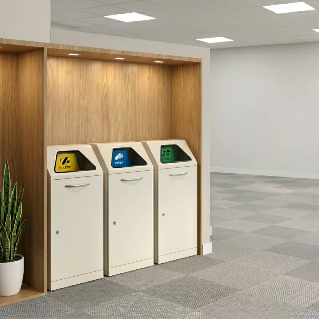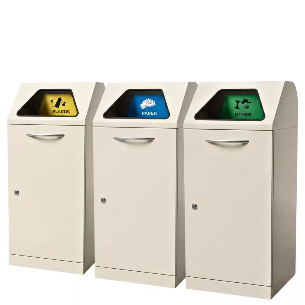 A fém szelektív hulladékgyűjtő - hármas szett a funkcionalitás és az esztétikum találkozása. Ezt az újszerű három egységből álló, prémium kivitelű konténersort kifejezetten modern irodákba, várótermekbe és közintézményekbe tervezték, ahol a fenntarthatóság és a rendezett megjelenés egyaránt prioritás. Háromrészes moduláris szelektív hulladékgyűjtő állomás, egyenként kivehető belső horganyzott acél tartályokkal és oldalra nyíló zárható ajtókkal.