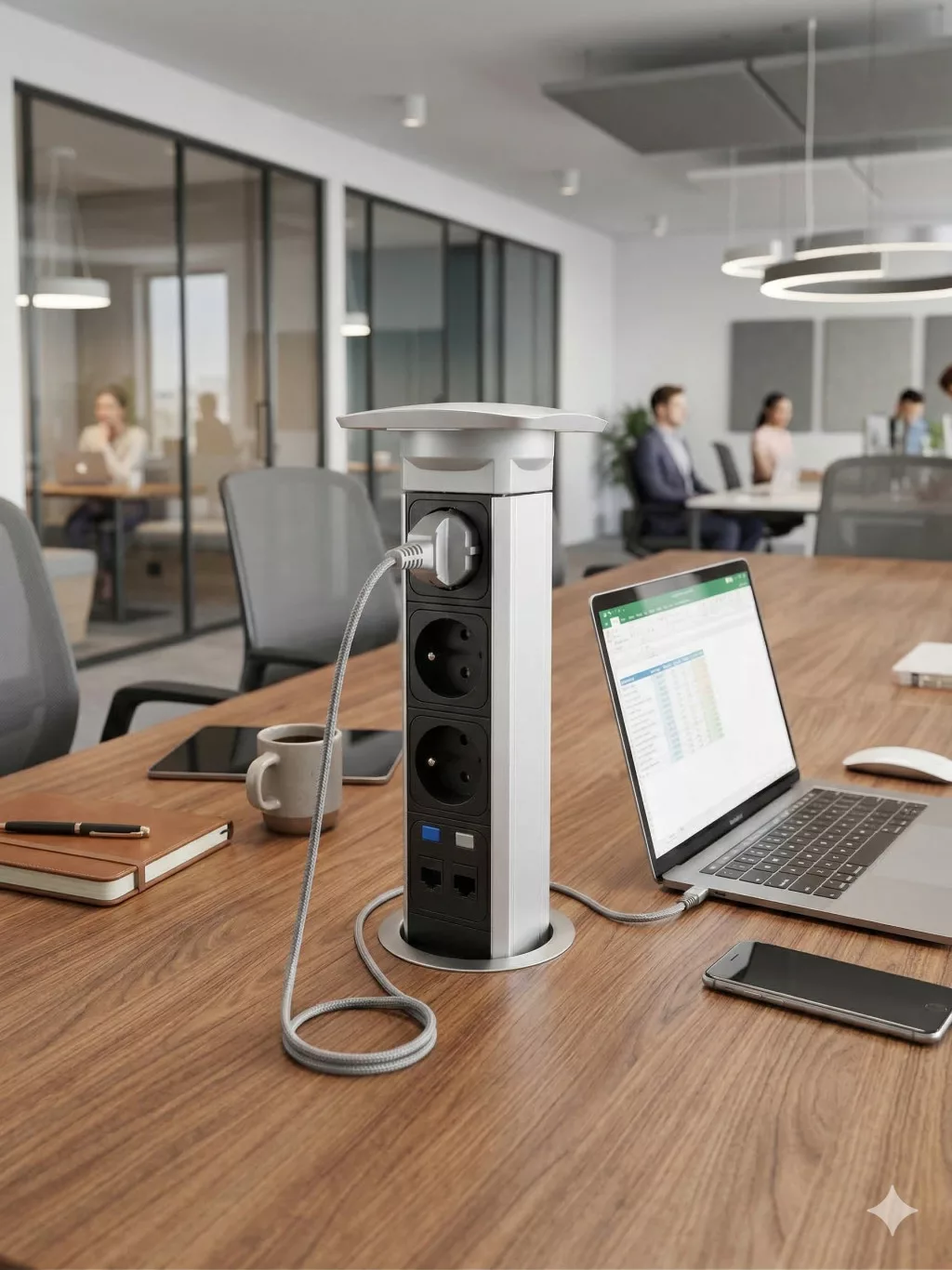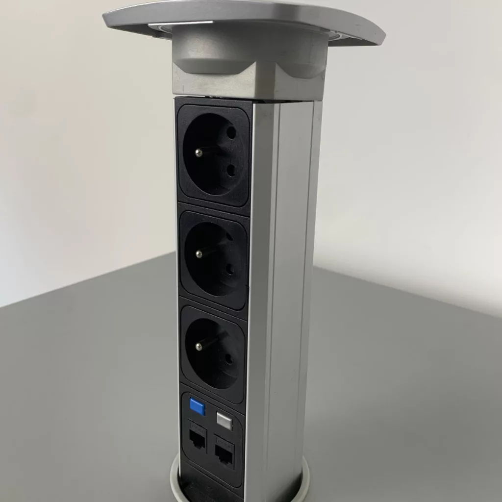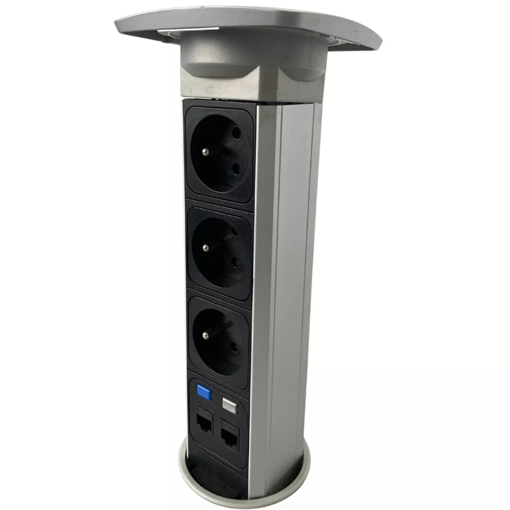 Ez a modern és praktikus újszerű eszköz egy asztalba süllyeszthető rejtett elosztó oszlop, amely kifejezetten irodai környezetbe, tárgyalókba vagy akár korszerű konyhai munkalapokba készült. A kialakítása lehetővé teszi, hogy használaton kívül teljesen eltűnjön az asztal síkjában, így megőrzi a munkafelület letisztultságát és esztétikáját, miközben szükség esetén azonnali hozzáférést biztosít az elektromos hálózathoz és az adatátviteli pontokhoz.
