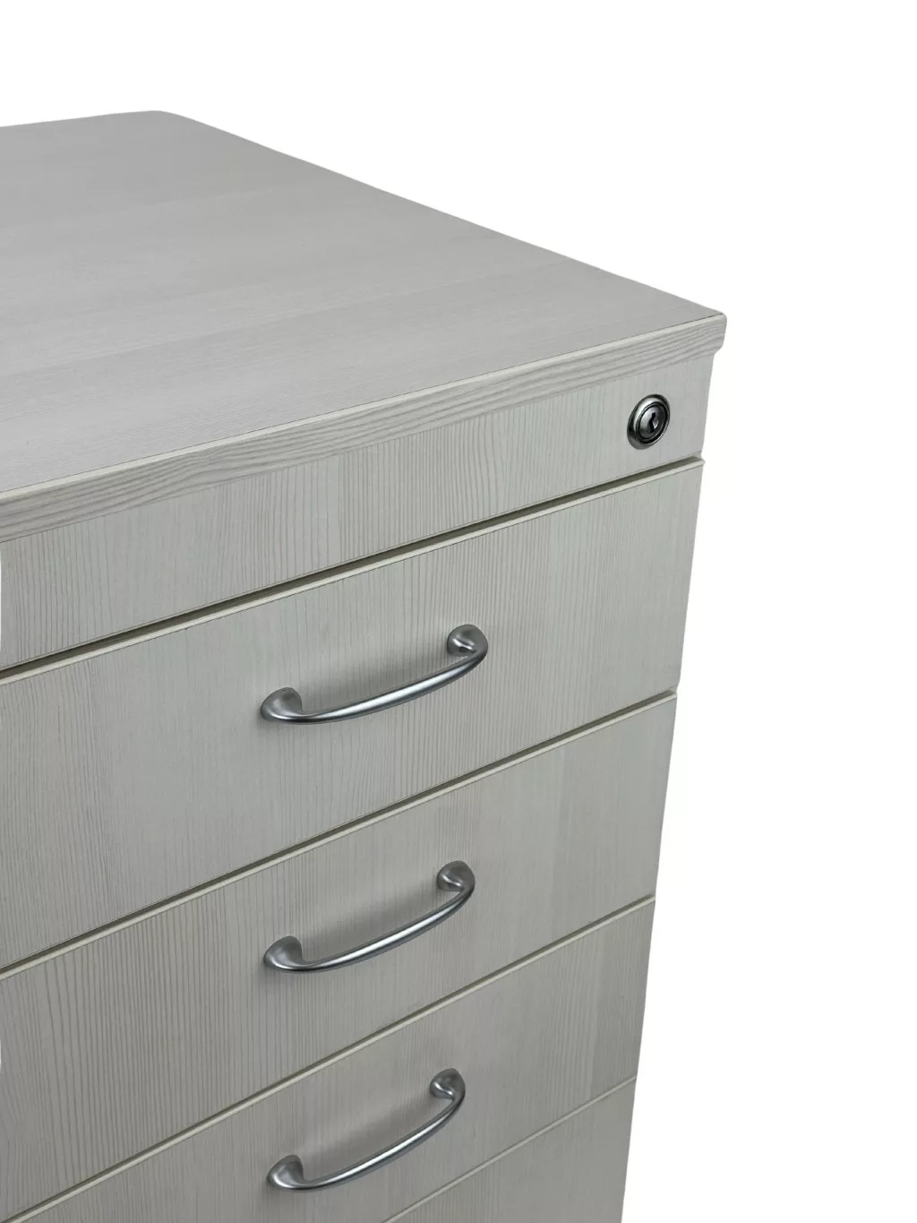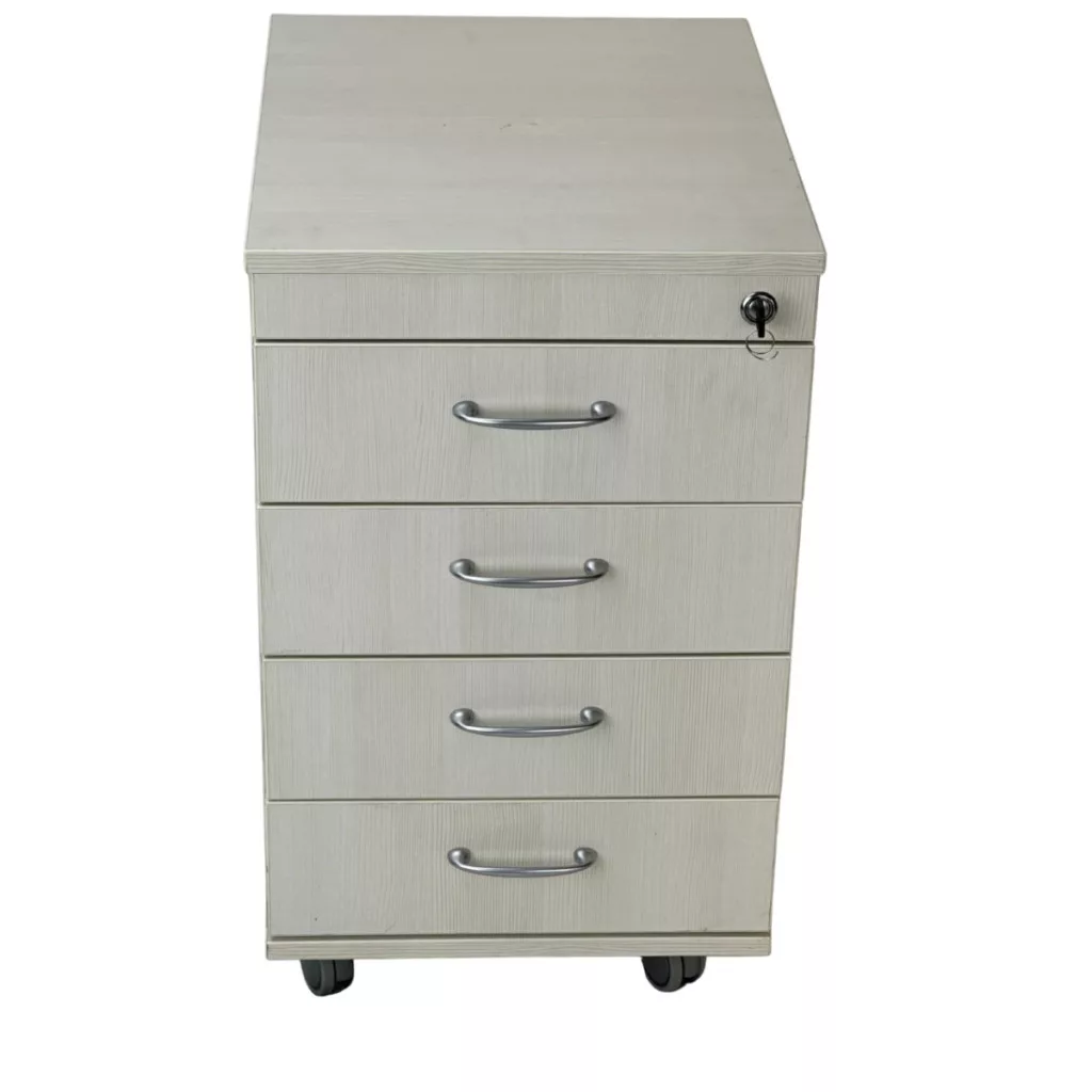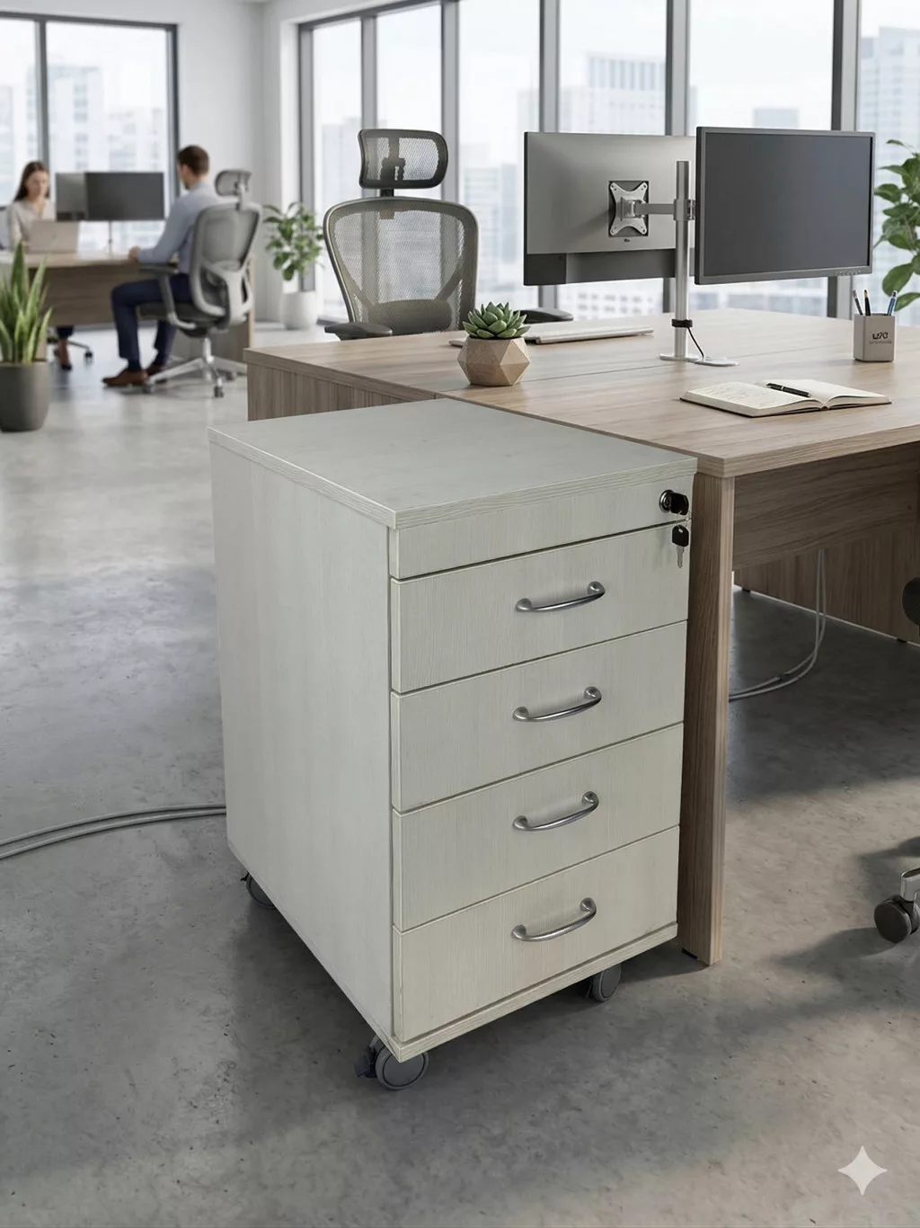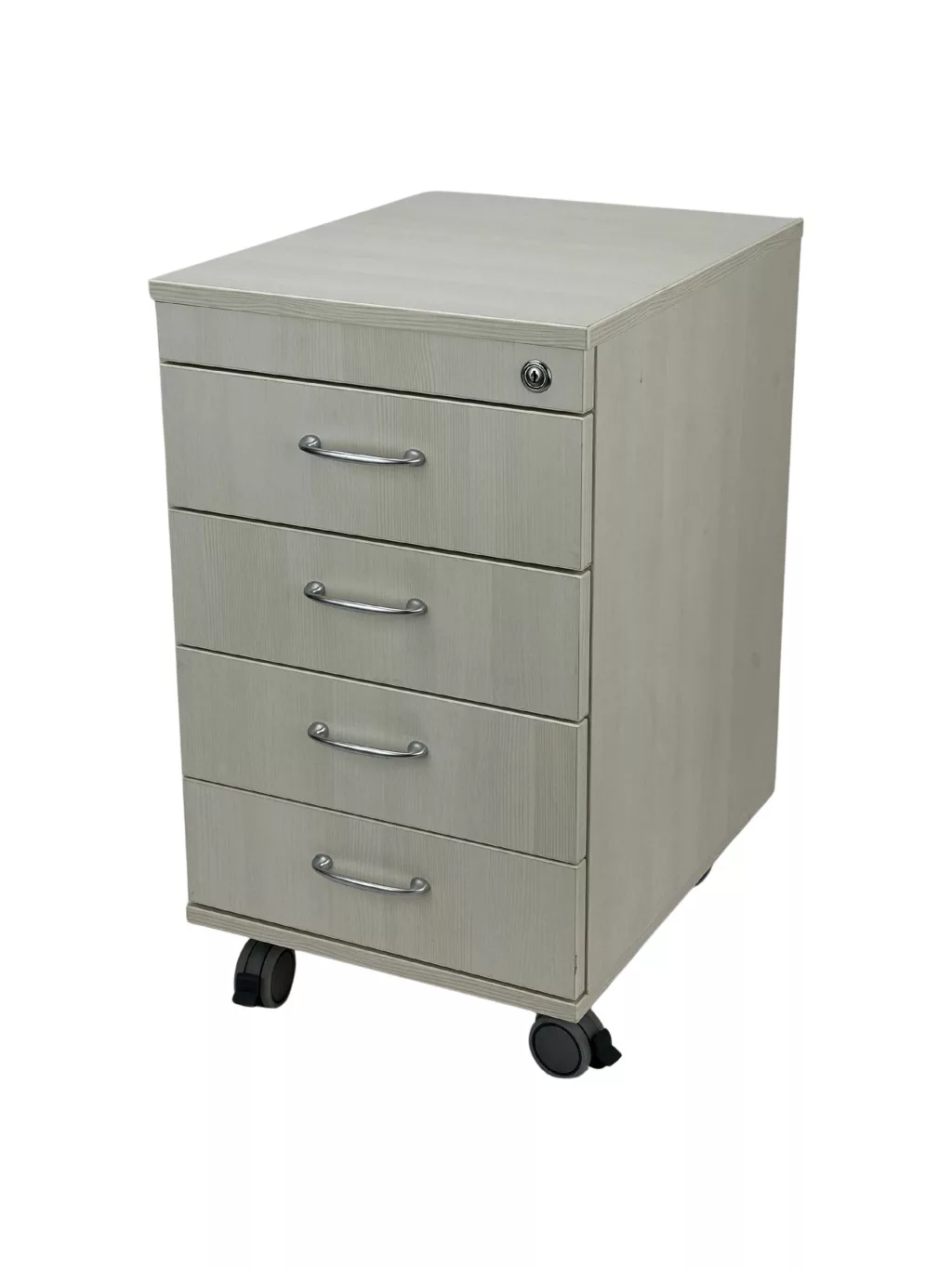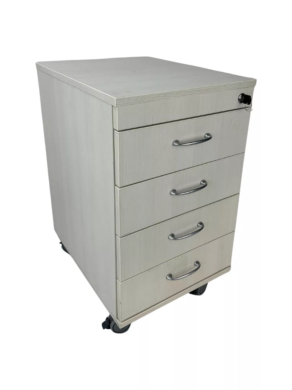 Ez a négyfiókos gurulós konténer letisztult formavilágával és praktikus kialakításával ideális kiegészítője bármilyen irodai vagy otthoni munkakörnyezetnek. Egyedi tervezés alapján, minőségi bútorlapból készült, világos juhar árnyalatban.
