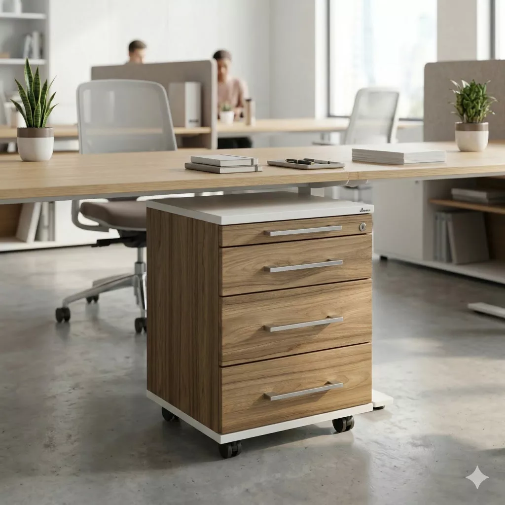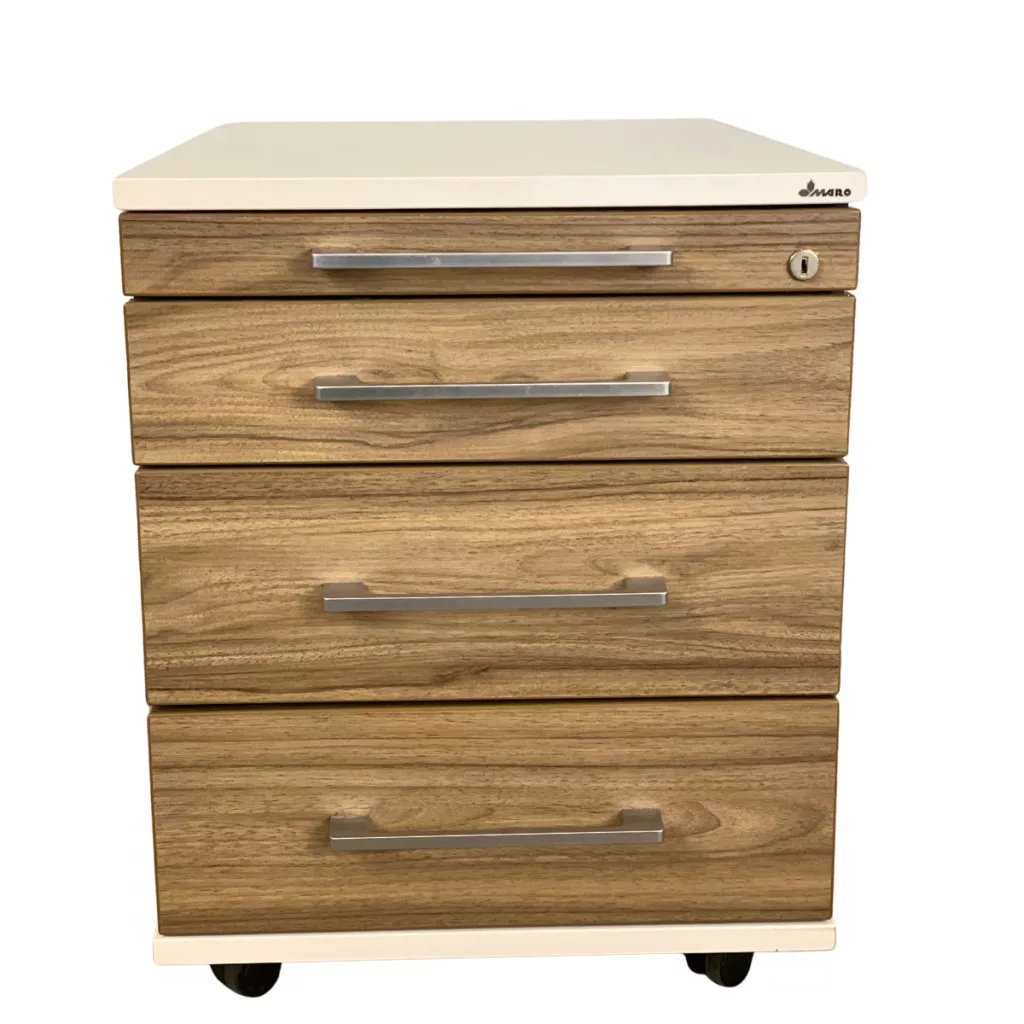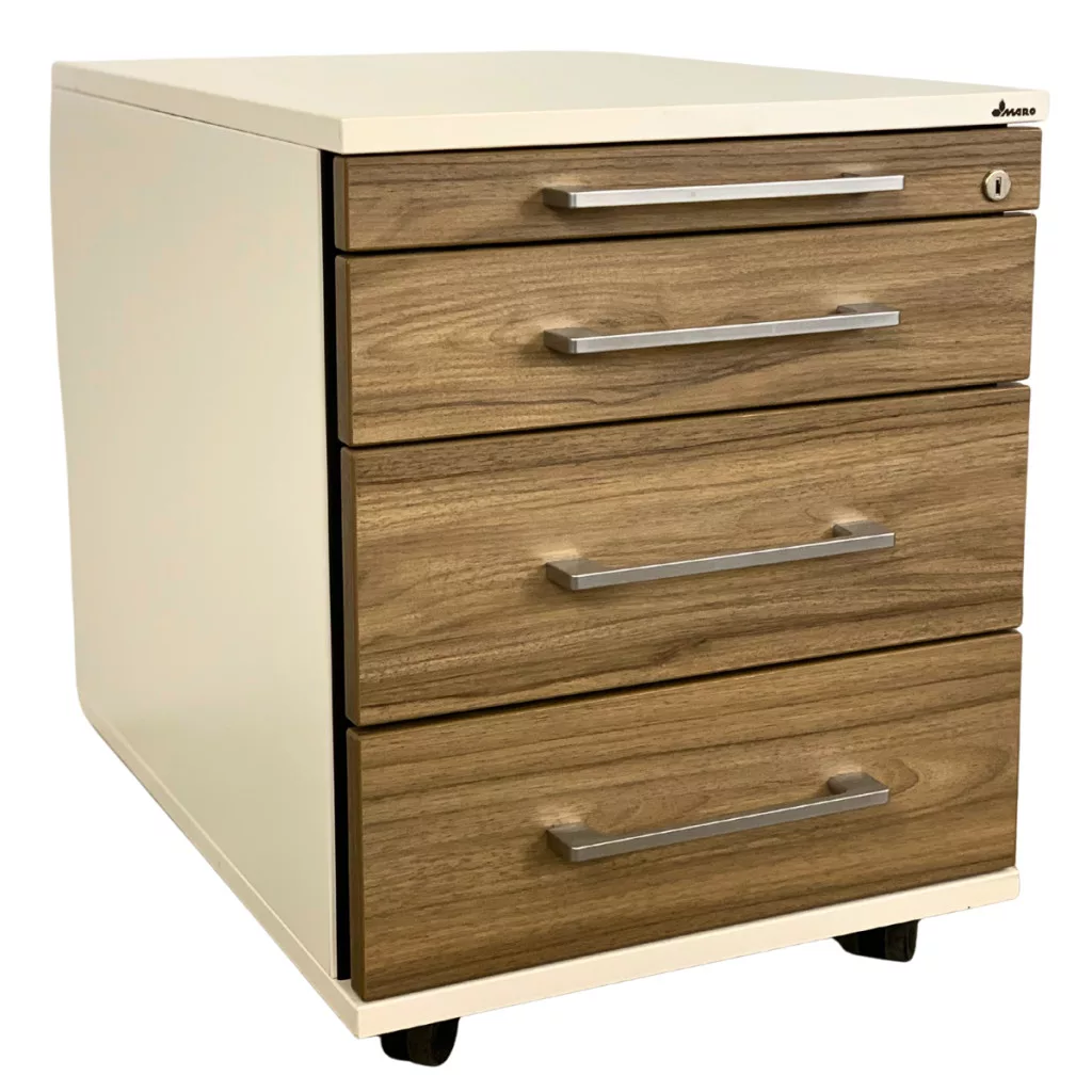 Ez a professzionális újszerű MARO mobil konténer a funkcionalitás és a modern esztétika ötvözete. A fehér váz és a természetes diófa mintázatú előlapok kontrasztja elegáns megjelenést kölcsönöz bármely irodai munkaállomásnak.