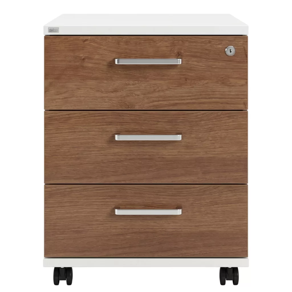A fa hatású előlap és az elegáns fém fogantyúk modern, irodai környezetbe jól illeszkedő megjelenést biztosítanak.