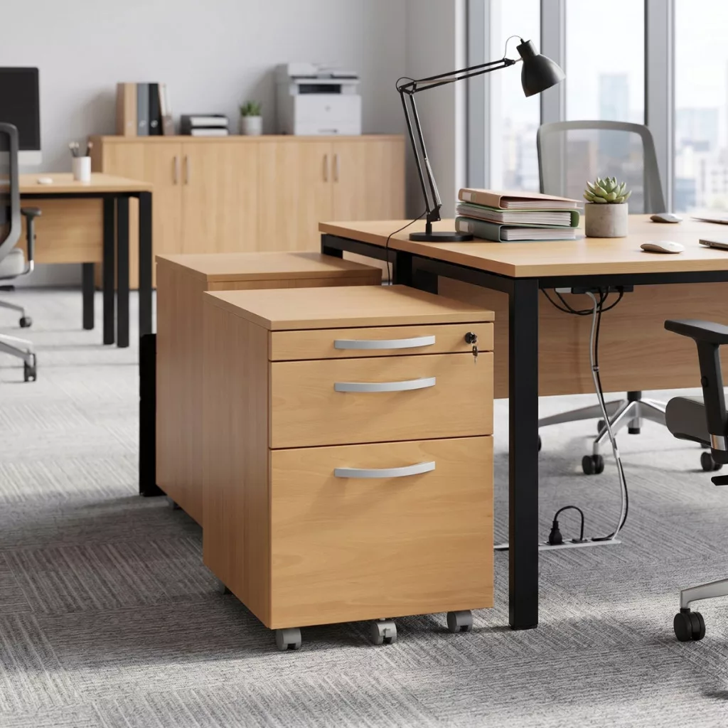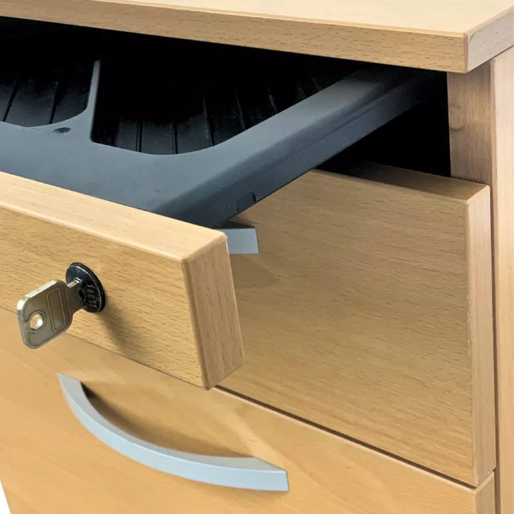 Ez a tölgy mintázatú újszerű konténer kifejezetten az iratrendszerezés megkönnyítésére készült. A három fiók közül az alsó, nagy belmagasságú fiók alkalmas függőmappás sínek fogadására, így az A4-es dokumentumok átláthatóan és gyűrődésmentesen tárolhatók.