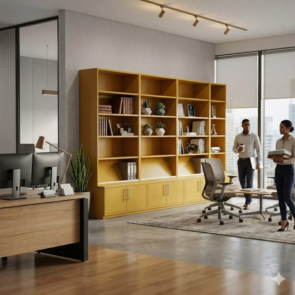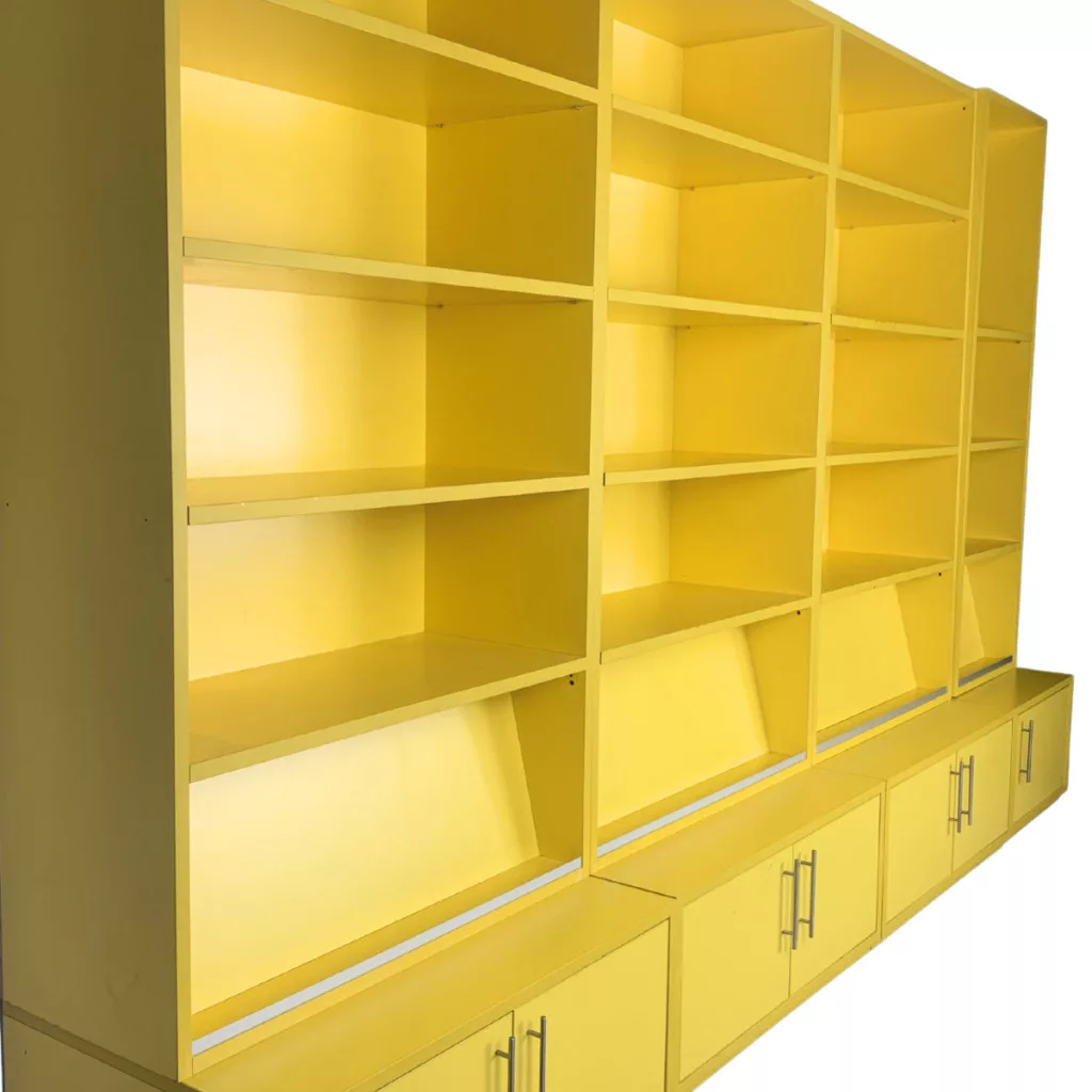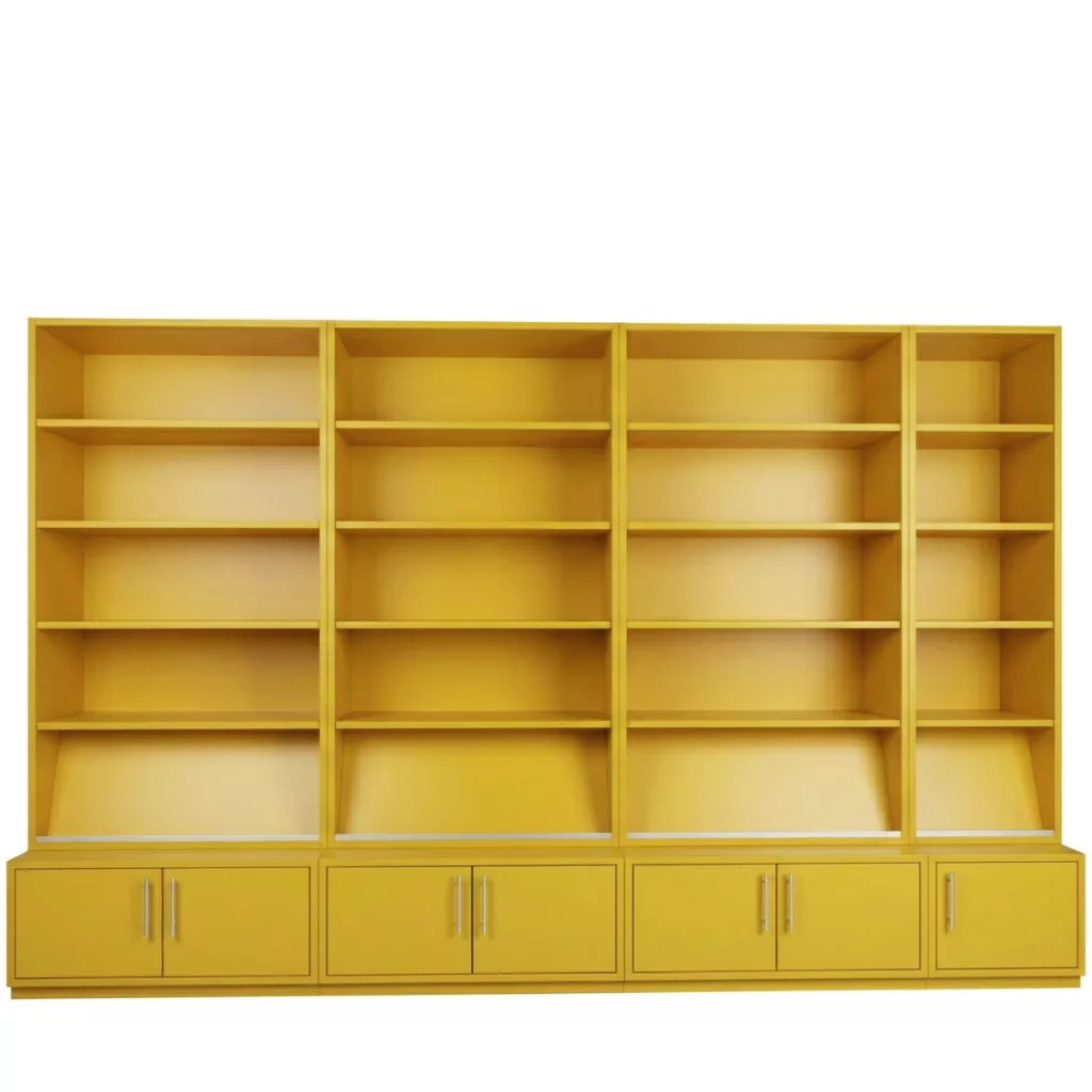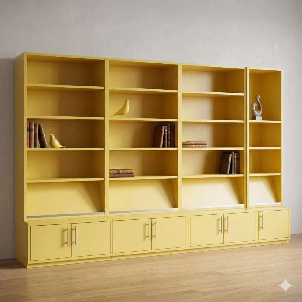 Ez a modern, újszerű sárga moduláris polcrendszer ideális választás irodai vagy otthoni munkakörnyezetbe, ahol a stílus és a funkcionalitás találkozik. A bútordarab egyszerre kínál tágas nyitott felületeket a dekorációhoz és zárt tárolókat az iratok rendszerezéséhez.