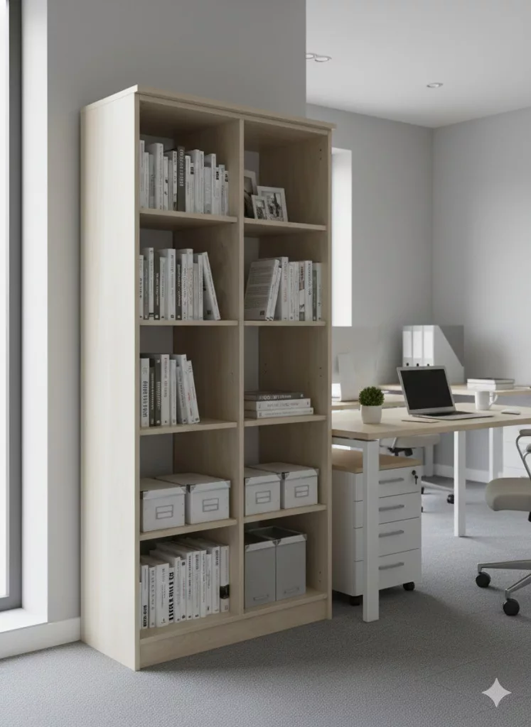 Világos juhar színű nyitott irodai szekrény 10 tárolórekesszel