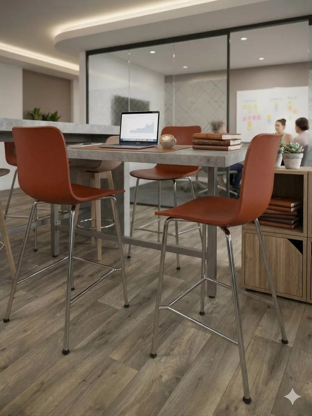 A krómozott acélvázas lábtartó stabilitást ad, miközben megőrzi a bútor légies megjelenését. Ideális választás modern konyhaszigetek mellé, irodai kávézókba vagy magasított tárgyalóasztalokhoz.